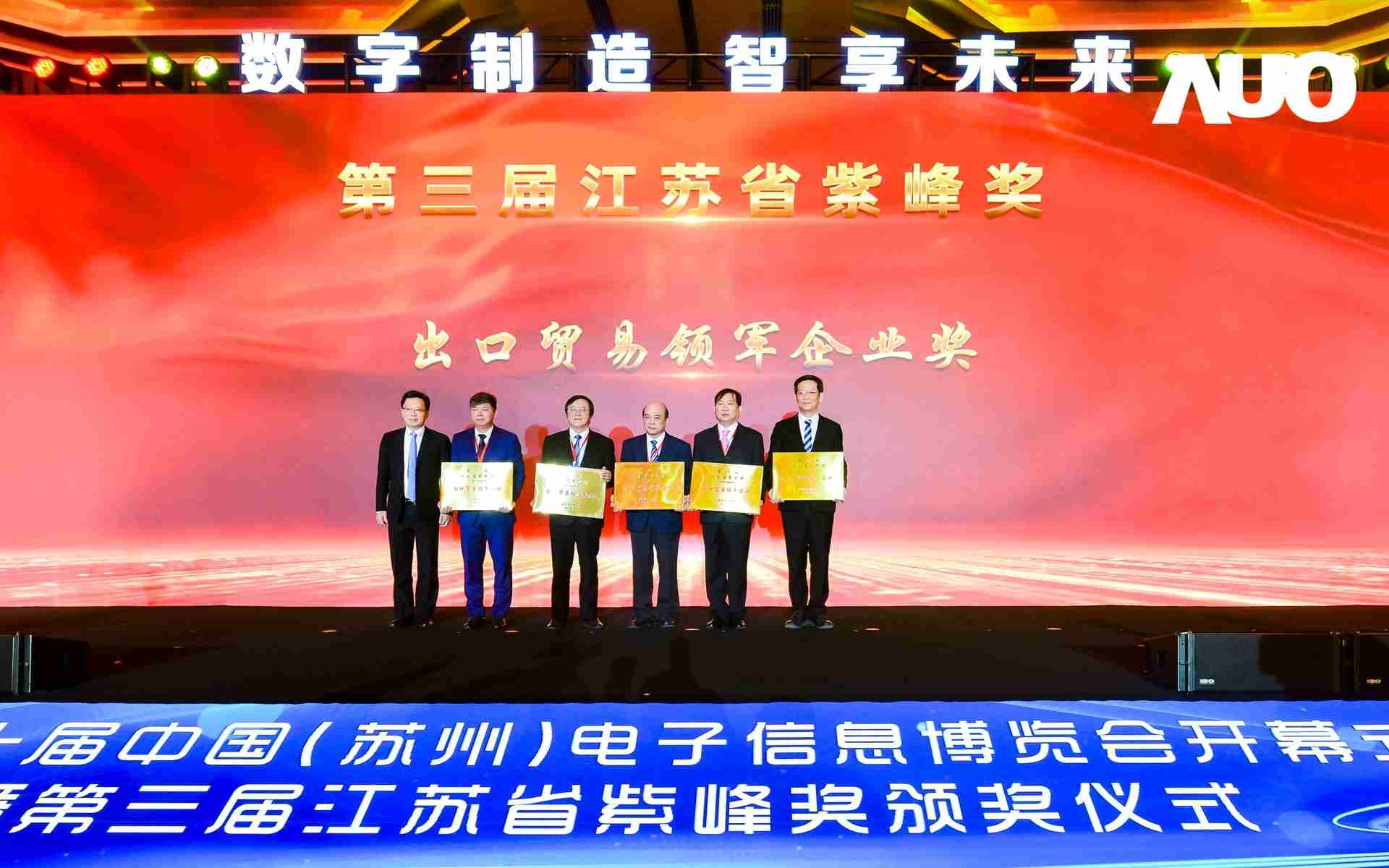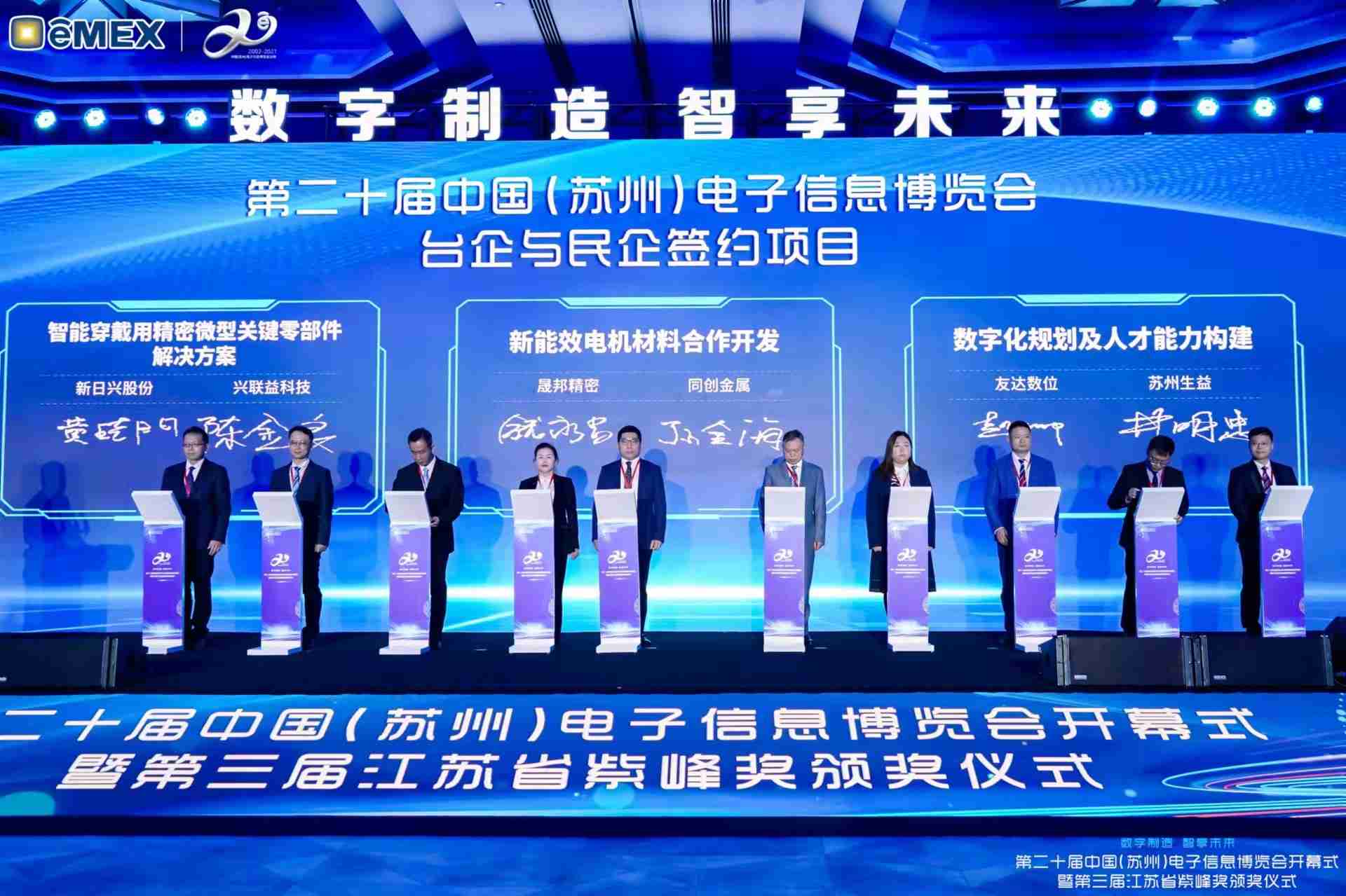 电博会开幕式当天也是第三届江苏省紫峰奖颁奖仪式,,省台办、、工信厅、、、、商务厅、、、、苏州市相关领导均出席并颁奖。。该奖项为表彰对江苏高质量发展做出积极贡献的在苏企业,,,,由江苏省政府专门设立。。。CG电子光电 (苏州) 总经理郭振明代表上台领奖,,,这也是CG电子苏州连续三次蝉联紫峰奖 出口贸易领军企业奖。。。。CG电子数位总经理赵丽娜女士,,,也参与本次开幕式,,,上台为本地化赋能签署战略合作协议,,将优质服务资源集合、、下沉到更多细分行业,,,为更多地区的制造企业提供数字化转型服务。。