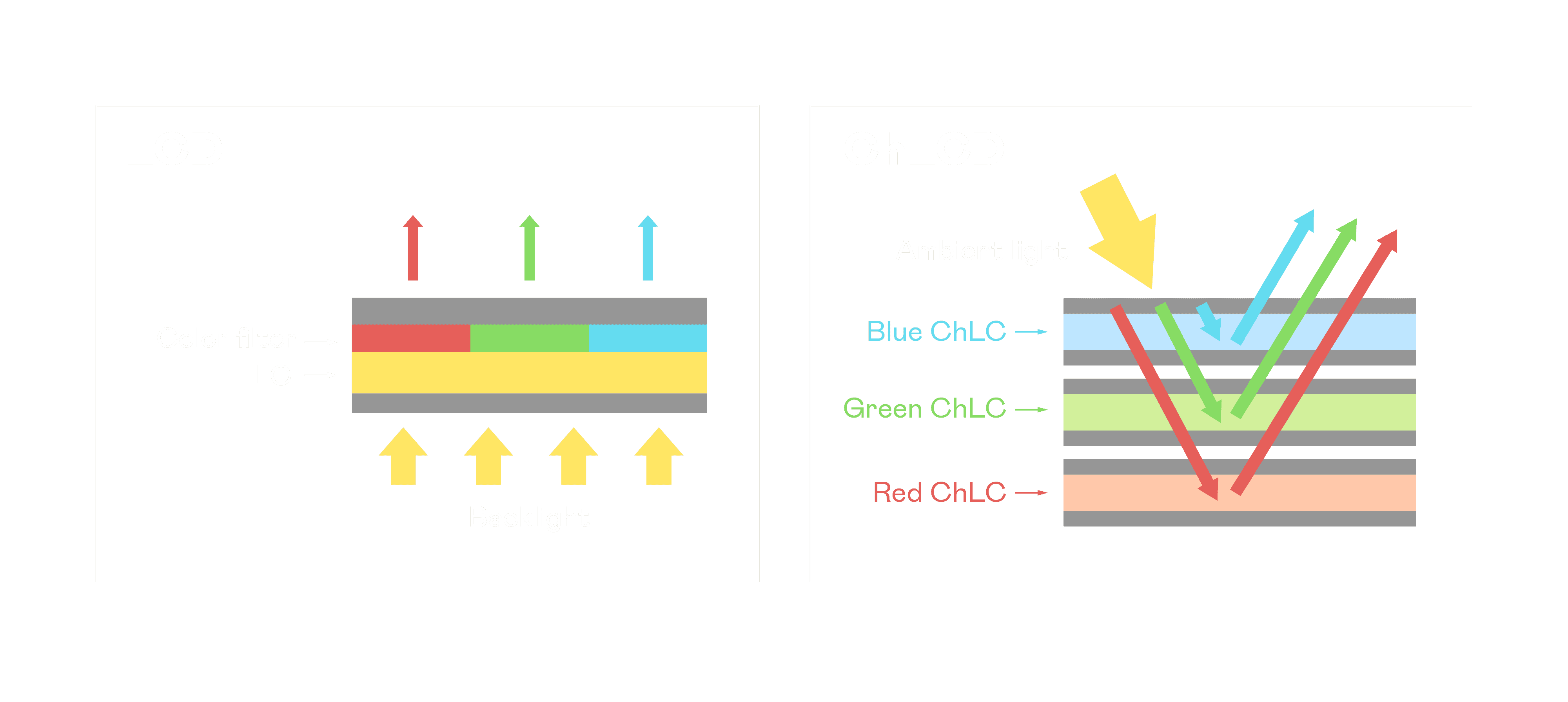ChLCD 胆固醇液晶就如同纸张一样,,,透过反射环境光来显示影像,,因此长时间观看不易造成人眼视觉疲劳,,可达到护眼效果。。当处于户外阳光下使用,,LCD 影像容易失真而不易观看,,但胆固醇液晶仍可维持较佳的影像品质。。。